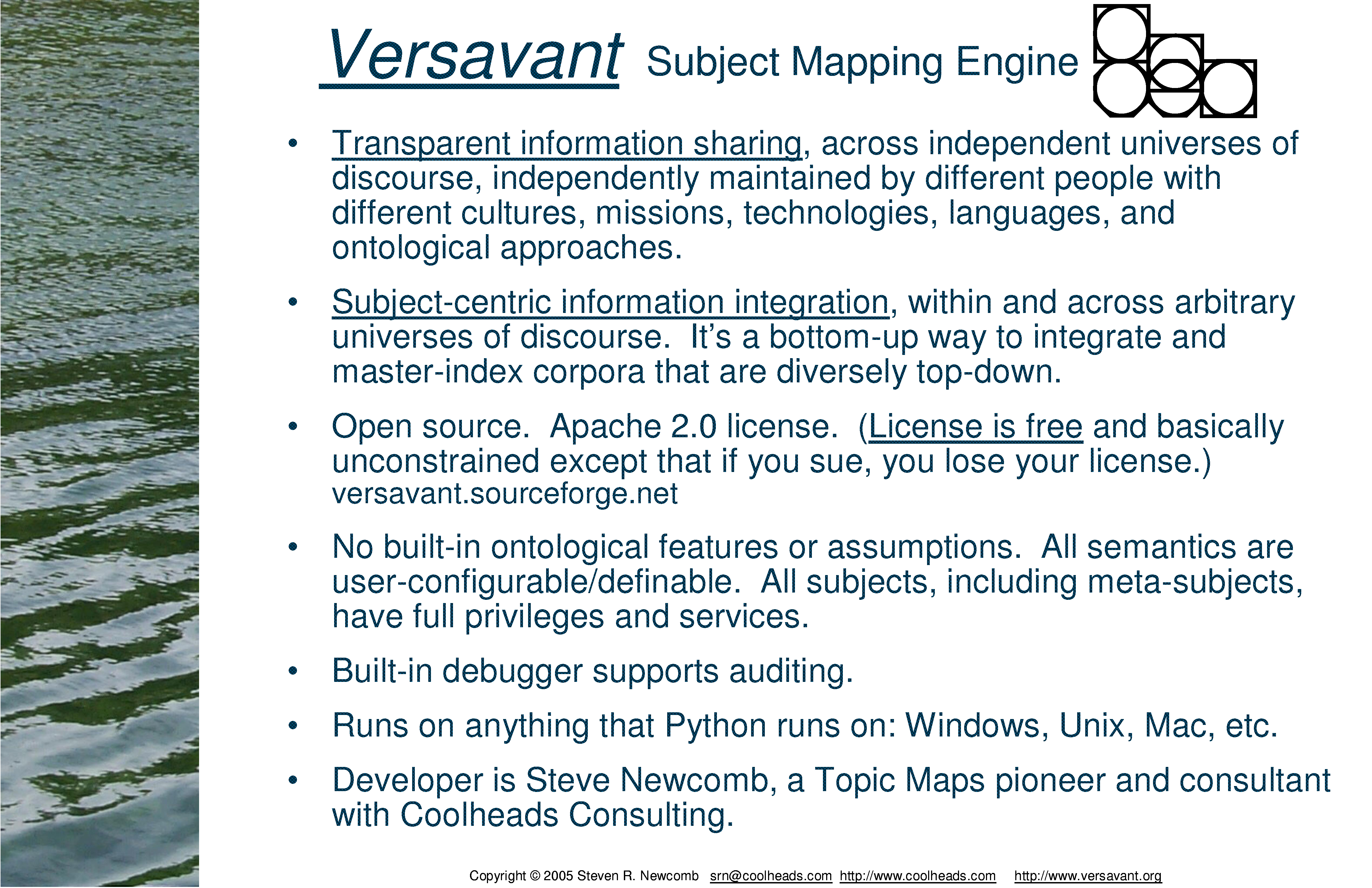 "Versavant" is the name that has been given to a particular way of describing/disclosing Topic Map Applications (TMAs) in accordance with the draft Topic Maps Reference Model, ISO/IEC 13250-5. Implementations of the Versavant disclosure discipline— "Versavant transparency engines"— can support any combination of TMAs in any single topic map. The merging of even ontologically diverse topic maps can be supported and even automated, without compromising the integrity of the information that each different topic map contributes to the resulting merged topic map.